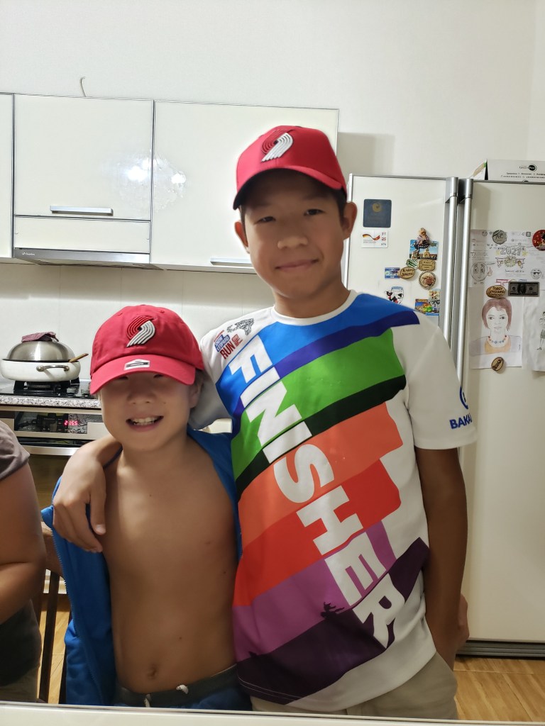 Bishkek 2021 Blog Istanbul on the way in (8/20/21) Bekjan (10) and Tengiz (12) in their new Blazers gear