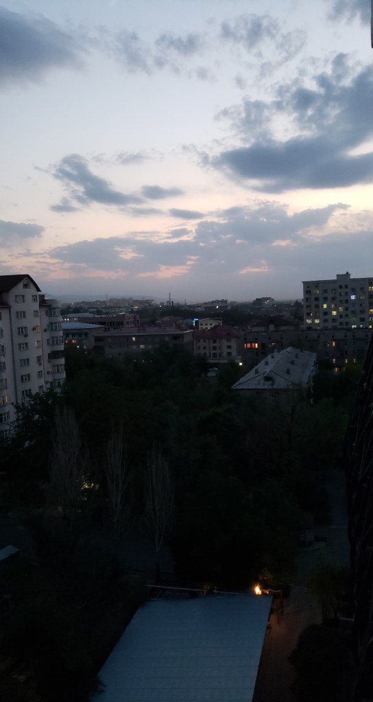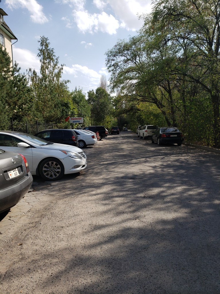 While the weather is still hot, I haven’t really been seeing too much new in the city yet. I have plans in the works to go visit the smaller of the two main city markets this weekend, though. Given the sunshine, however, I figured I could take some pictures of my daily surroundings while it’s still nice out. I have noticed that Bishkek is incredibly green compared to what I would have expected for this geographic region — it really helps to offset the Soviet architecture and makes everything seem more welcoming in general. Past my building, Fatyanova Street basically starts to look like any Portland neighborhood, what with all the trees and the somewhat narrow road. My building itself is pretty nice, all things considered; it’s definitely had work put into it since the Soviet era and I like the apartment my host family lives in very much. The most interesting relic of Soviet history that still lives today in Bishkek are the street names, though: my school is on Sovietskaya Street (which has an official name that nobody uses even 30 years later), the main road out of the city to the west is called Deng Xiaoping Avenue, and Gagarin and Friendship of Nations Streets are both nearby. It’s definitely a present reminder along with the architecture of what was here not too long ago.