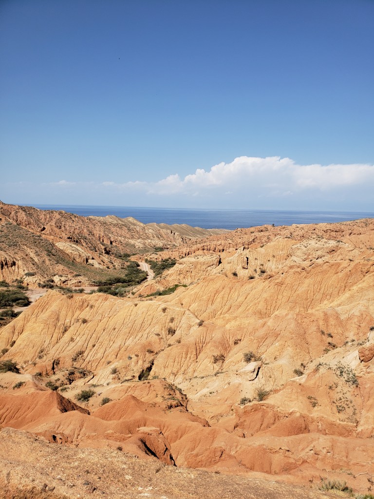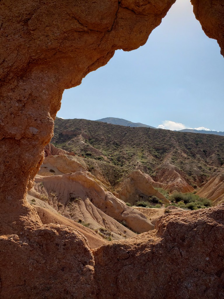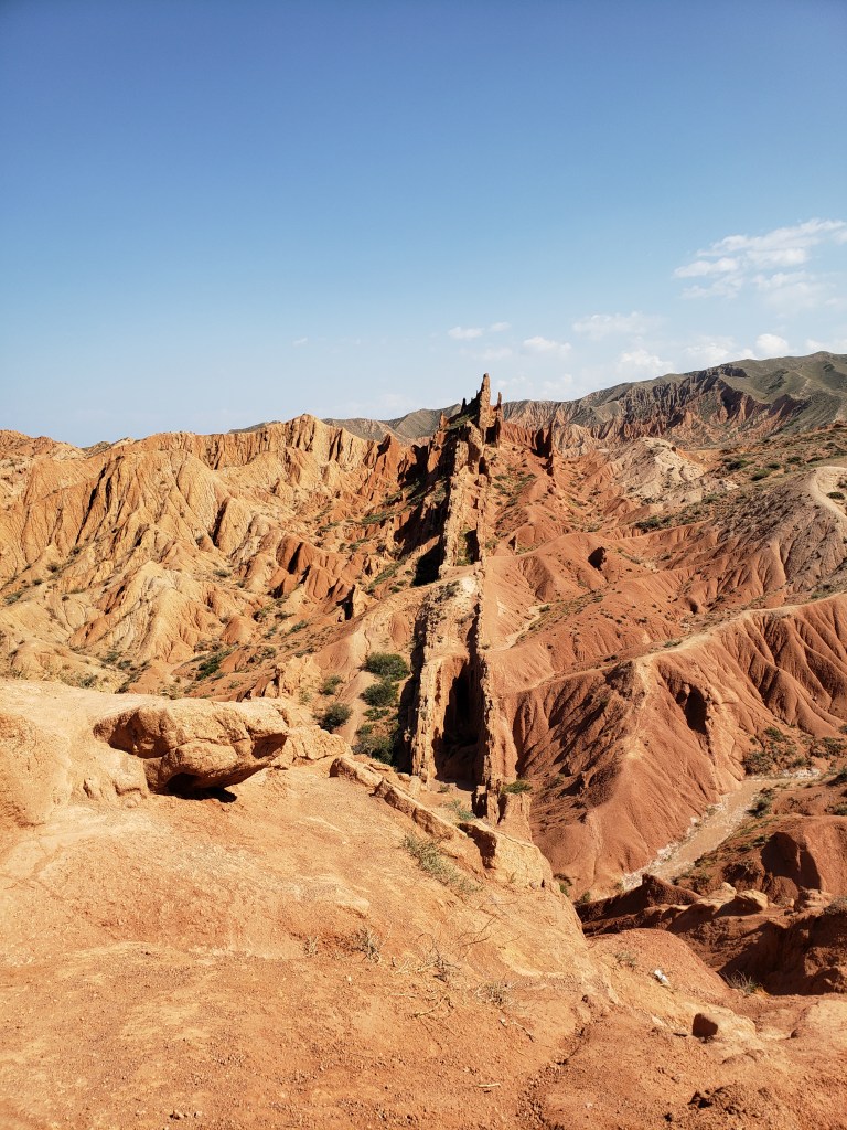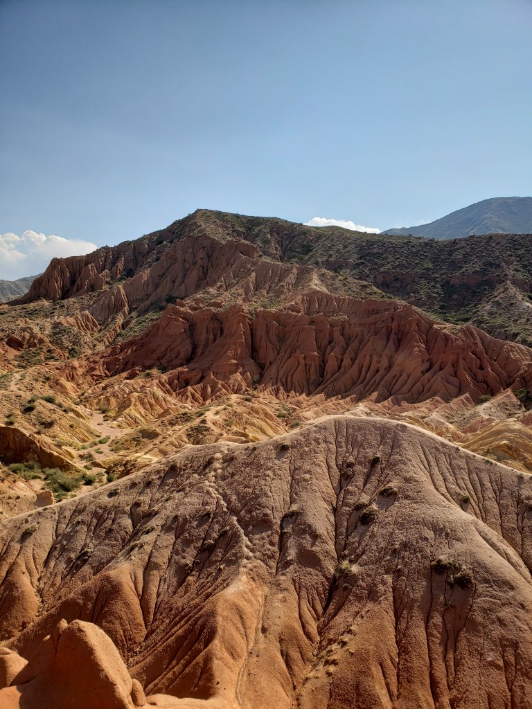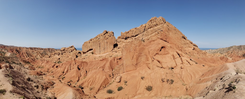 The second place we visited on the way back to our village was Skazka Canyon. Skazka (Сказка) translates from Russian as “fairy-tale”, and the canyon certainly earns its name. Though photos rarely do justice to natural beauty, the unfortunate truth is that Skazka is even more heavily affected — it was a truly breathtaking place, especially considering where we had just been, less than an hour away. Look back at the pictures from Barskoon again! Skazka looks like it’s a different planet, yet is really relatively close. The first photo in the collection is of the Great Wall of Skazka, a natural rock formation that runs the length of the red rocks, and that we ended up climbing through for the majority of the time. Skazka was an amazing place that I would have loved to have spent more time in, but it was very hot out already and most of us were ready to head home.