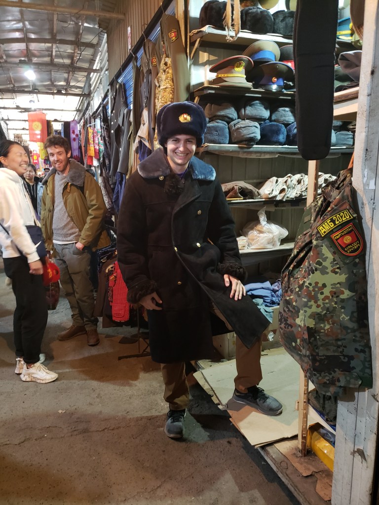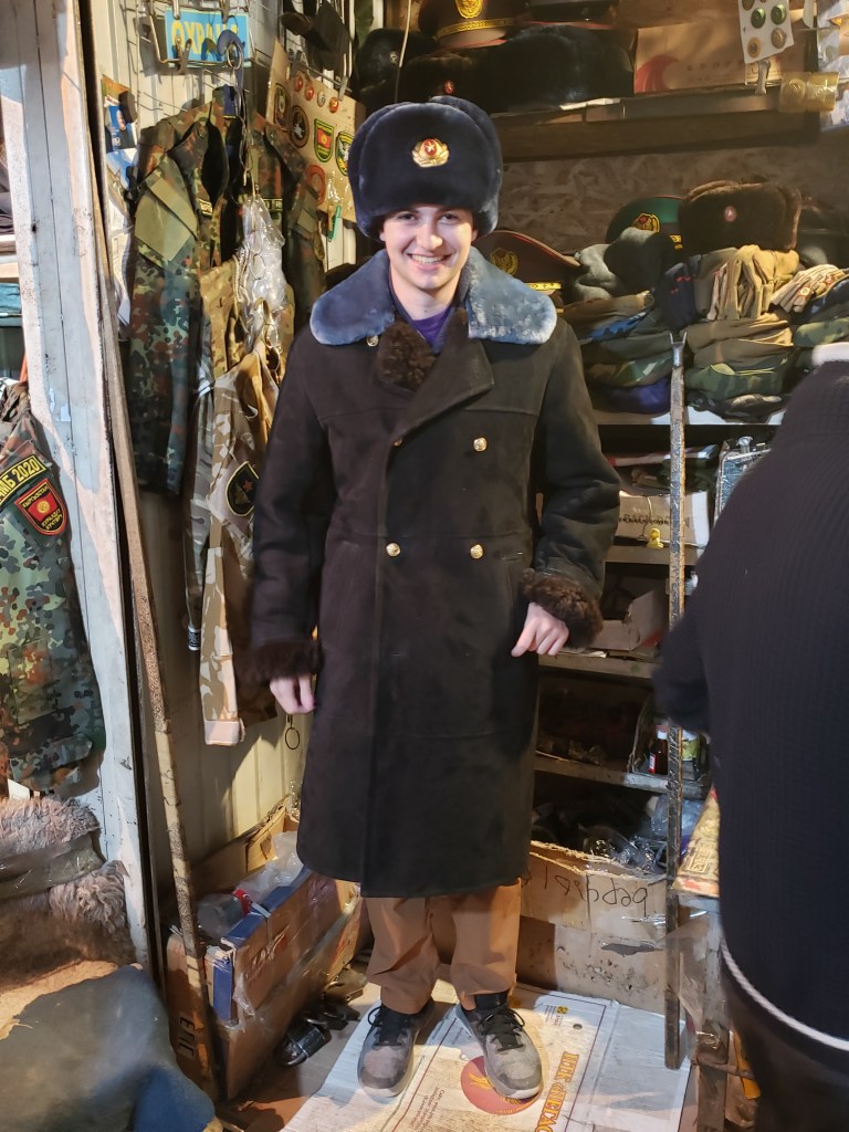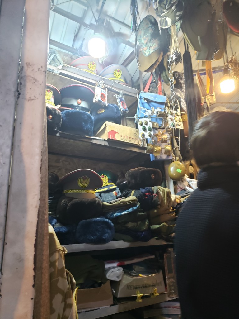 Here you can see yours truly wearing a very heavy, very warm officer’s overcoat and an equally ridiculously warm Ushanka fur hat. In the background of the first photo stand Kathy and Liam, clearly enjoying the scene. The vendor, whose name I unfortunately never got, was quite chatty and obviously loves both the job of being a vendor in the market and the collection of antique military items. It is clear that he keeps his wares in great condition, as evidenced by the fact that he allowed us to check out and try on a pristine 1940s-era Soviet rank-and-file soldier’s winter outfit and also told us that film companies often purchase from him. I certainly plan on heading back to his stall to see what else I can dig up around there — and who knows, I may end up with an excellent Halloween costume at the end of it all.