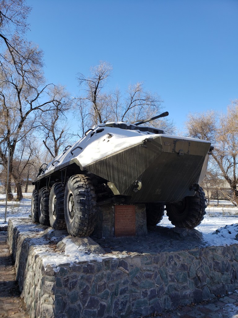 Once I arrived, I was met by Nurik and his cousin Sula and taken to see some of the limited sights of Kara-Balta. It’s important to note that Kara-Balta is the 8th largest “city” in Kyrgyzstan at a whopping 45,000 people (counting the nearby villages within the limits), so the sightseeing was never going to be the best. But that didn’t stop it from being memorable – I got to see a Soviet BTR armored personnel carrier in a nearby park, a remaining Lenin statue near one of the schools, and the nice hammer and sickle monument at the entrance to the main city park. In that same park I got a picture with the “I heart Kara-Balta” sign, which just has to be a rare picture to have. The other pictures of me are near the railroad tracks at a spot which I thought was interesting.