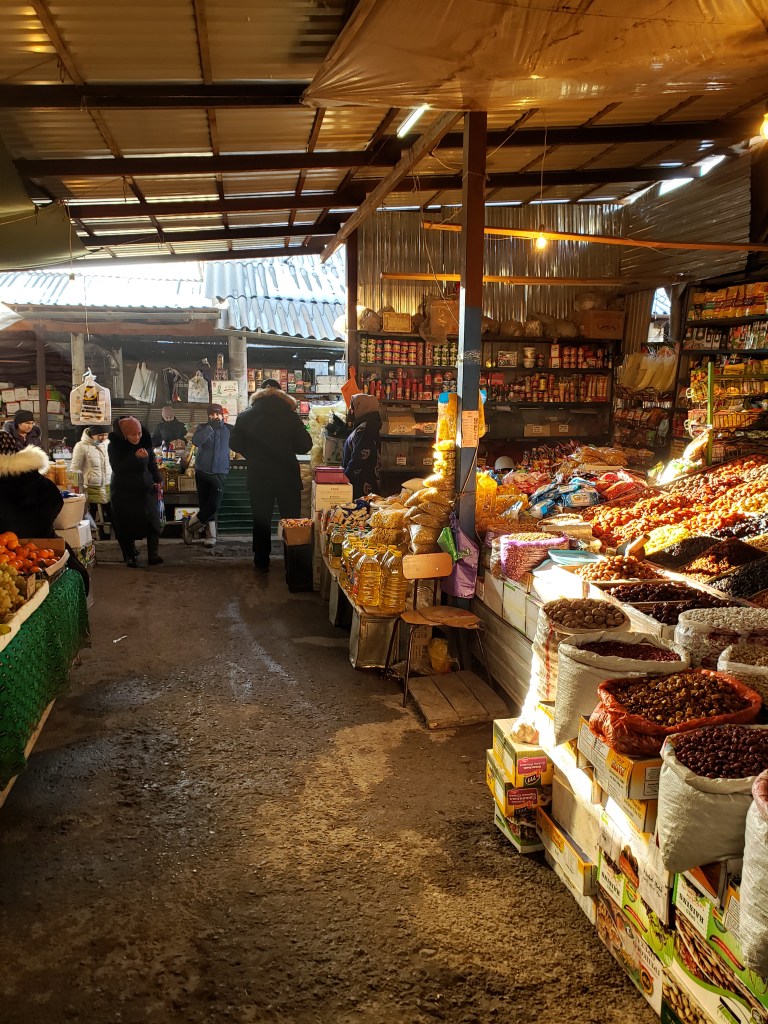 Our final stop before I headed out in early evening was the larger of the two markets. While not quite as large as Osh Bazaar in Bishkek, it was still decently sized, and I’d wager a guess that you could find most anything you would need there. Due to the time of day, weather, and lighting, I dearly wished that I had with me a better camera than my phone, because there were lots of opportunities that my poor cell couldn’t quite handle. The last picture here is the closest to doing it justice, at least. Just imagine that same photo, but about 50% more pretty and better composed.