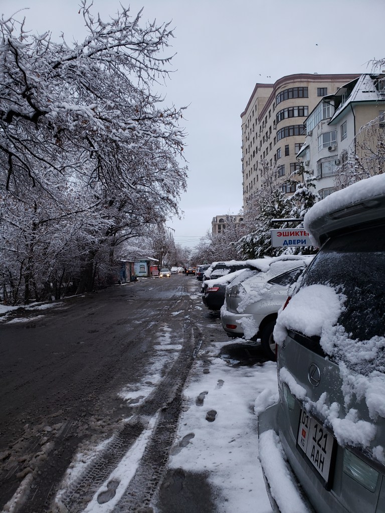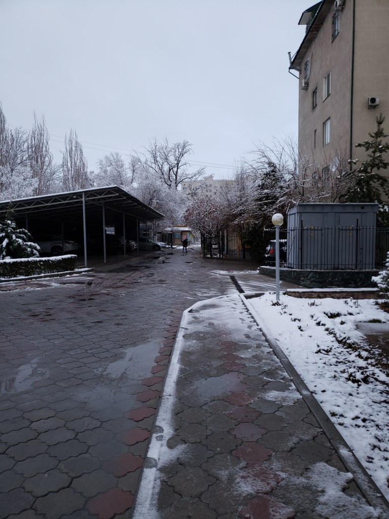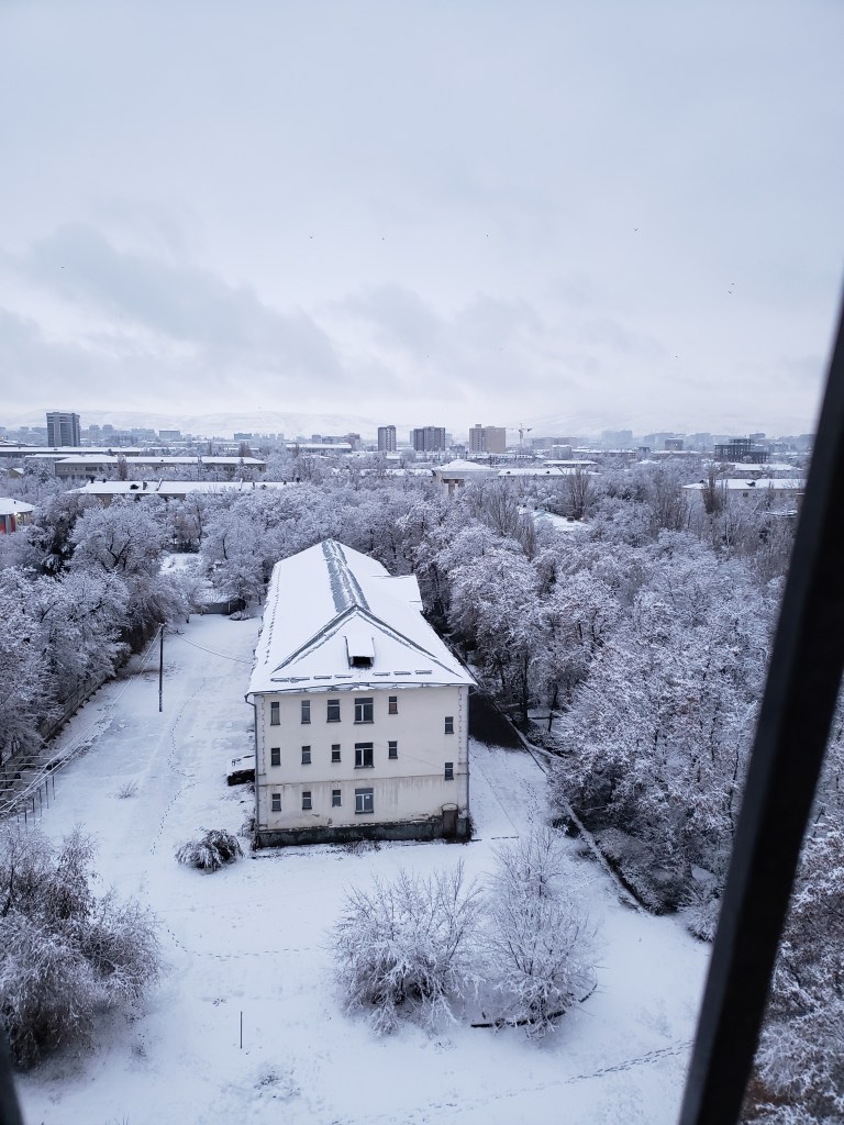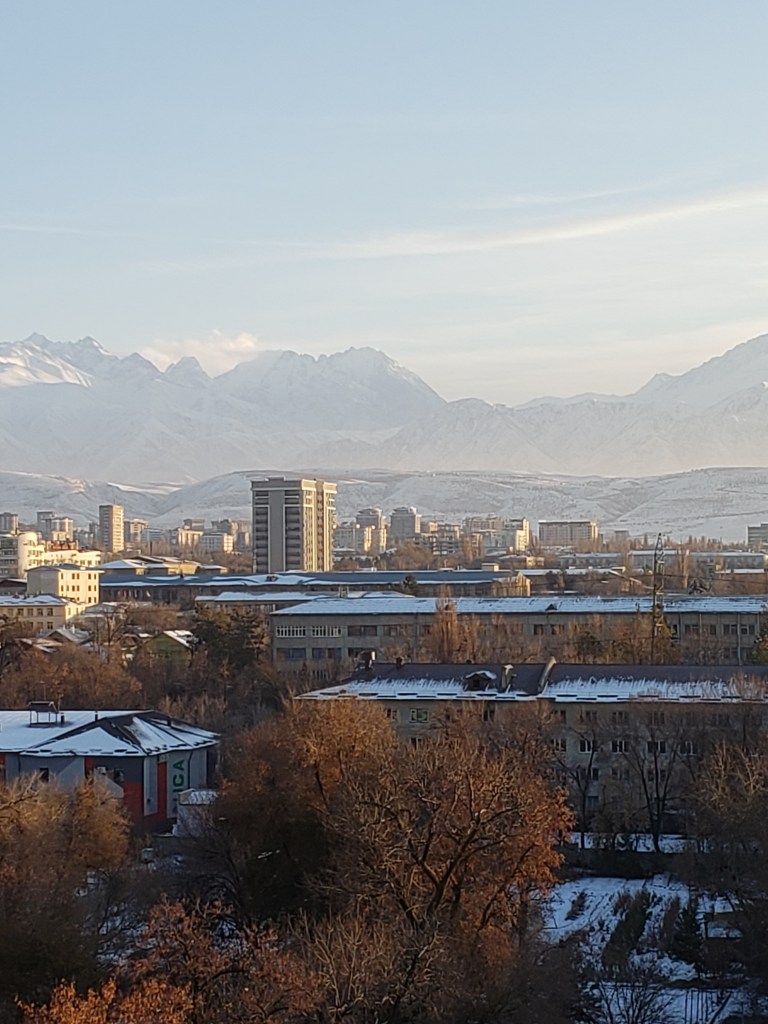 I usually try to wake up at around 7:30 – at least, that’s when my alarms start going off. In reality, I’m up by 8:00… or 8:15. On the day that I took these photos, it had snowed overnight, although it was still pretty warm outside (around 38 degrees in the morning), so it had all melted by evening. Here you can see the southern end of Bishkek under cloudy skies.