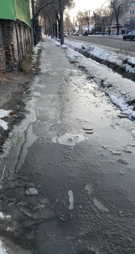 Here is the little parking area outside my apartment building, followed by Fatyanov street, named after the well-known Soviet poet and songwriter Alexei Ivanovich Fatyanov. The walk to school in the slush is never pleasant, but I honestly prefer it to when it’s really icy out. For context, here’s a typical sidewalk after several days of below-freezing temperatures:
