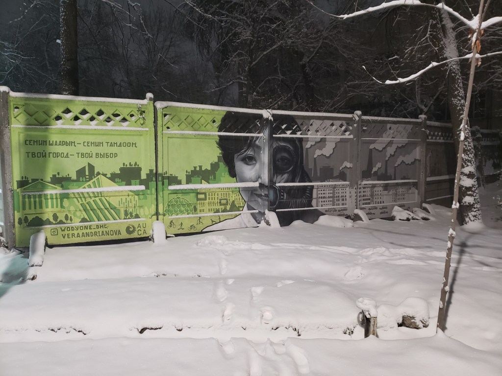 On the way home it snowed again, lots more this time, and I took a detour through a park. I found there this rather striking mural, which says in Kyrgyz (top) and Russian (bottom) “Your city – your choice.” These Soviet/post-Soviet style concrete walls all around the city make great canvases for street artists, of which they take full advantage.