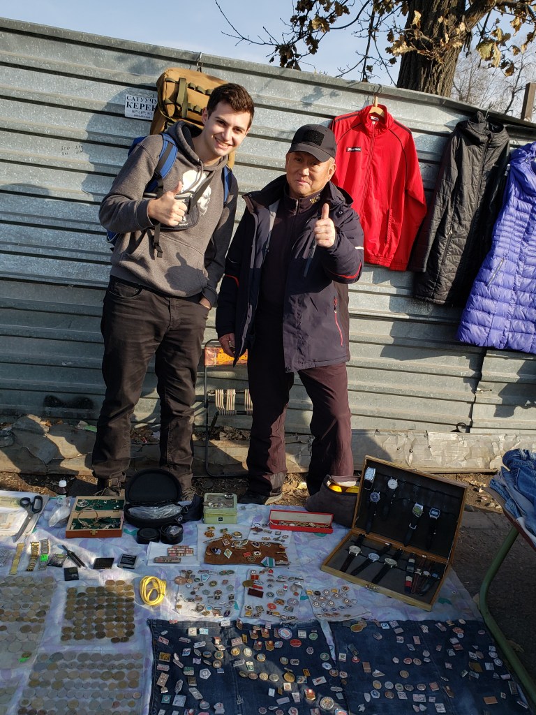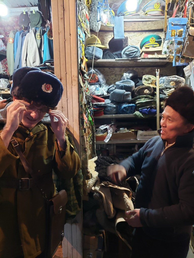 On the left we have myself and Vycheslav, a street vendor who sells Soviet pins, watches, old currency, and similar such items. I bought a pin from him way back in early October, and he still remembered me a few months later; he even complimented me on my language improvement. On the right is Jake with the famous Darubai, mid dress-up session. Darubai is the most enthusiastic and energetic person I’ve met here in Bishkek, which is actually saying a lot. I’m making a trip back to the bazaar before I leave with the special intention of saying goodbye for the winter and thank you, since he really has made my time here just that much better.